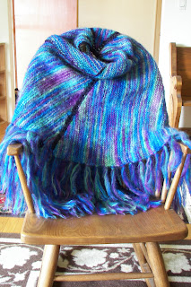 [I was in high school in the 60's, when v-neck cabled mohair sweaters were all the rage. I didn't have enough money to purchase one of those sweaters, so I've been compensating for my deprivation ever since. I have an entire of mohair! One hank has been calling to me but I never had the right pattern for it. Ellen's Half Pint Farms Brushed Mohair (one pound) in Northern Lights colorway. I once saw the Northern Lights while camping in Ontario, while floating in a river at night. thus, the blues, purples and greens were like a Siren song. ]